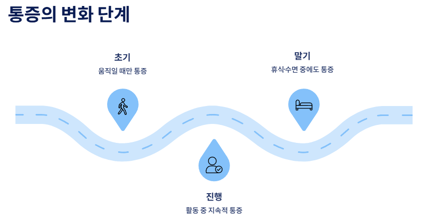후기에는 가만히 있어도 통증이 지속되는 경우가 있어 삶의 질을 크게 떨어뜨릴 수 있습니다.