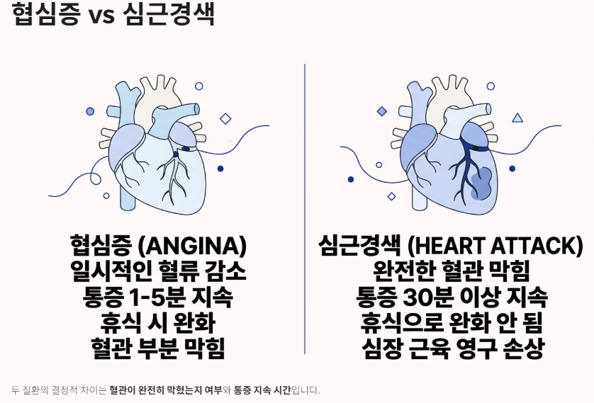 협심증은 일시적 혈류 감소, 심근경색은 혈관이 완전히 막힌 상태입니다.
