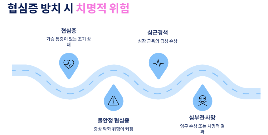 특히 초기에는 증상이 가볍거나 간헐적으로 나타나기 때문에 놓치기 쉽습니다. 하지만 이를 방치하면 심근경색으로 진행될 수 있어 조기 인지가 매우 중요합니다.